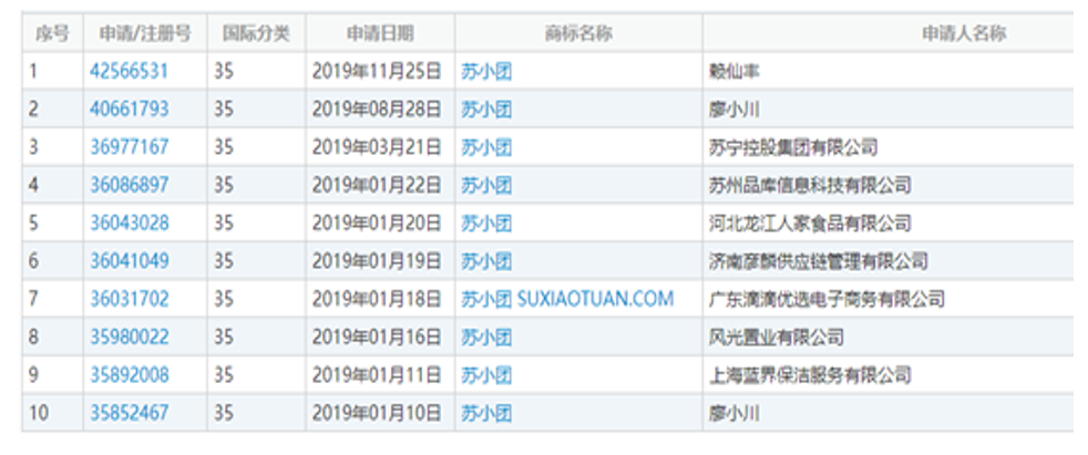 “苏小团”是苏宁社区拼团项目名称,2019年1月10日,“苏宁小店”集团商品经营中心总经理透露,苏宁将在2019年1月18日开启社区拼团项目,拼团项目定名为“苏小团”。该消息一出,2019年1月10日当天,某自然人就在第35类申请“苏小团”商标(于2019年8月28日核准注册),其后2019年1月11日、16日、18日、19日、20日及22日,陆续有多个主体在35类申请“苏小团”商标,带起一波抢注风。