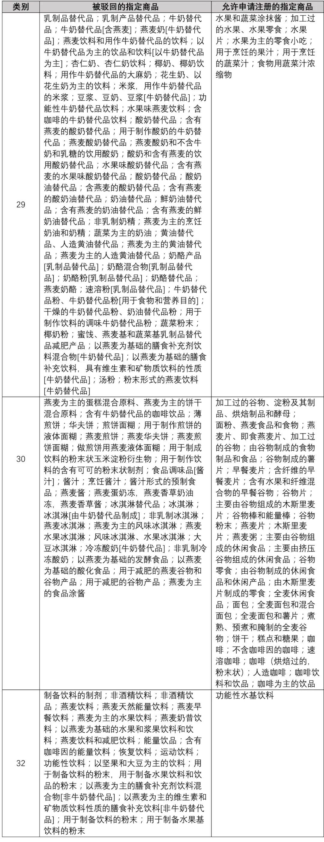 2019年9月5日,审查员援引《欧盟商标条例》(EU 2017/1001)第7(1)(b)及第7(2)条,允许“IT’S LIKE MILK BUT MADE FOR HUMANS”商标在第18和25类全部商品上的注册,但驳回了该商标在第29、30和32类部分商品上的注册申请(关于第29、30和32类的指定商品的具体信息,可见附表)。